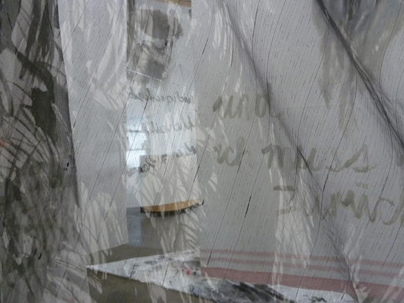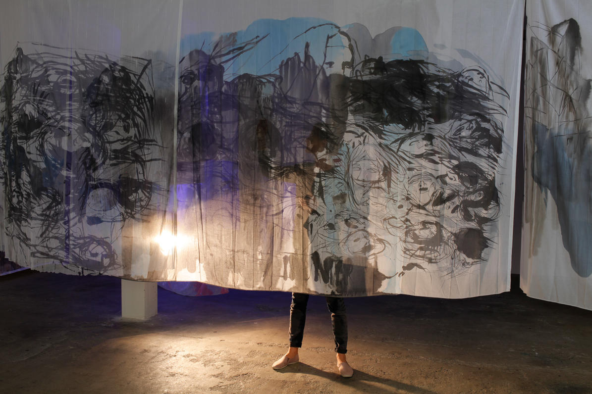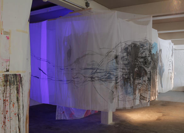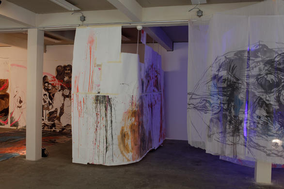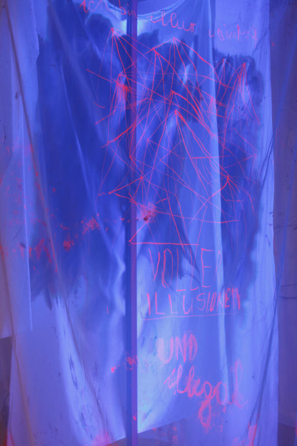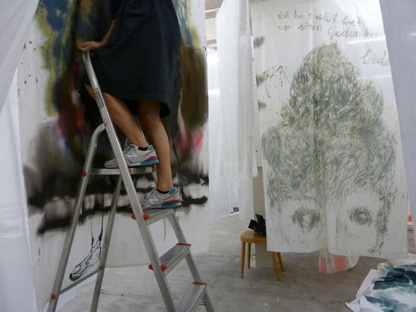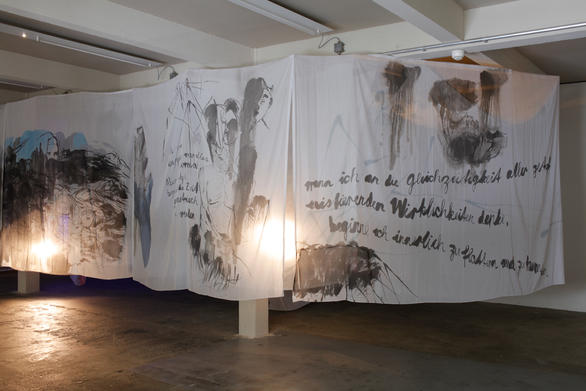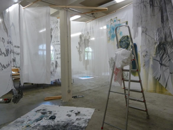 I work on large surfaces covering entire walls and try to push the boundaries of classic drawing. The abstract painting action bridges over to linear, comic-like sequences and illustrating elements. These are complemented by writing and language. That way, a story arises in the room, which completely envelops the observer. In my work, I trust in the moment, react associatively and take what emerges from it further. I treat the large paper and fabric panels like sketchbooks and thus, topical issues of content and personal feelings manifest themselves. The process character of my work becomes apparent in various respects. Sometimes, the installations emerge on the scene, where I include the existing space and the circumstances, or they are drawing actions where my work is a performance in front of an audience and keeps growing. At other times, videos document the development and the deconstruction of the installations and hint at the fact that the work is not finished after a position.