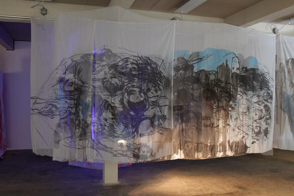 Drawinghell is a drawing installation and an overextension for me every time. It always emerges with the situation on the scene. This time, it deals with the topic of forced displacement.