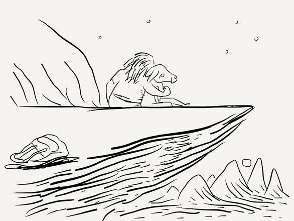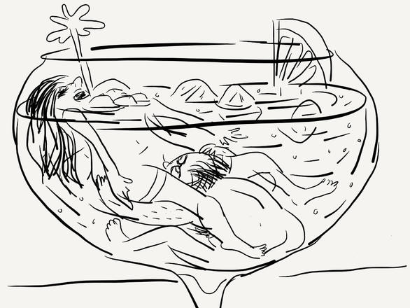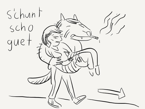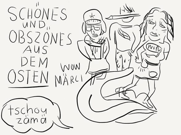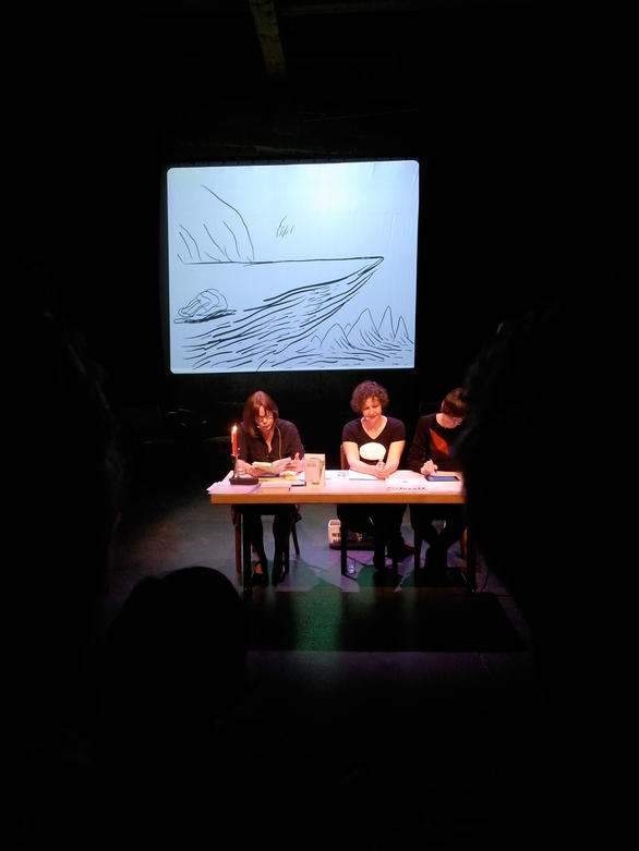 Andrea Gerster und Ulrike Ulrich read their own texts, I draw along with it. At the same time, the two authors help with the words for the speech bubbles of my projected comic.