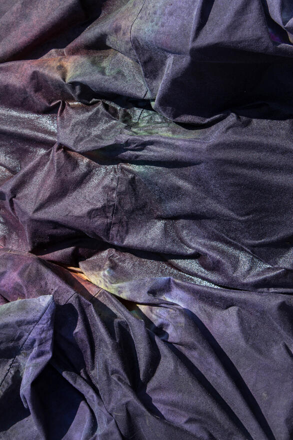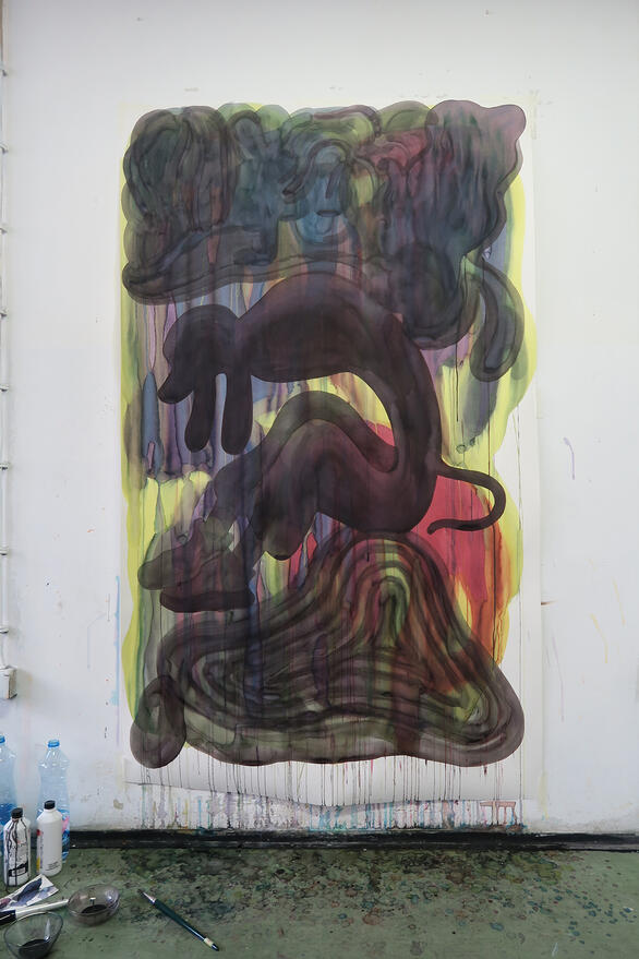 Another aspect regarding content in a material sense are cloths and curtains on which I work. I buy those materials on flea markets and in secondhand shops. On the one hand, those objects already have a history that is inaccessible to me, on the other, it is sustainable material. Those fabrics will be painted, washed and reworked over and over again. Boundless production and wasting in the name of art is often disregarded; with my modus operandi, I want to counteract that.