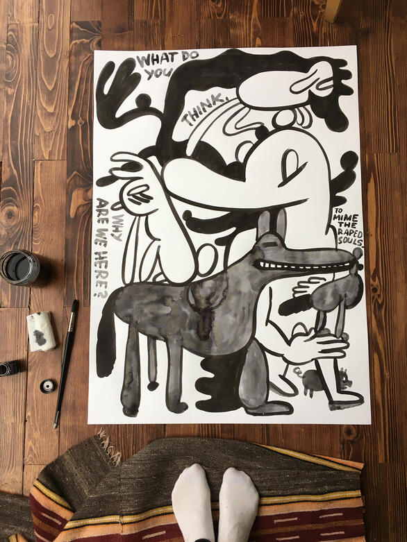 „In Belgrade, I want to try out new approaches by bringing together the different strands of my artistic career, such as textile design, illustration, cartoon, drawing, performance, installation and sculpture. For some time past, those elements connect organically in various formations, but I want to melt together the work in a more explicit conglomerate. With the help of my ways of working, such as actions in the public sphere, drawing, sketch books, and also in relation to contemporary and historic events, I want to explore how forms of expression depend on the place and time of their emergence. My vision is to let expression and language become a sculptural form, to bring together the complex levels of installation and to relate them to contemporary drawings and paintings. The involvement with the interesting cultural history of Belgrade, the architecture, exhibitions etc. and encounters in the public sphere, are supposed to generate content focus and multilayered meanings.
