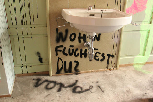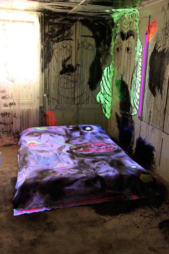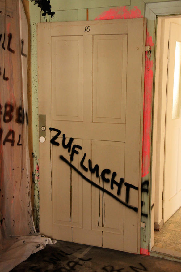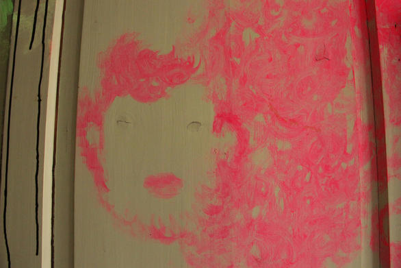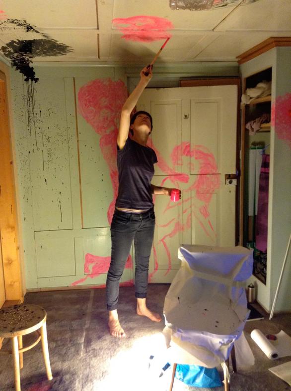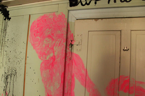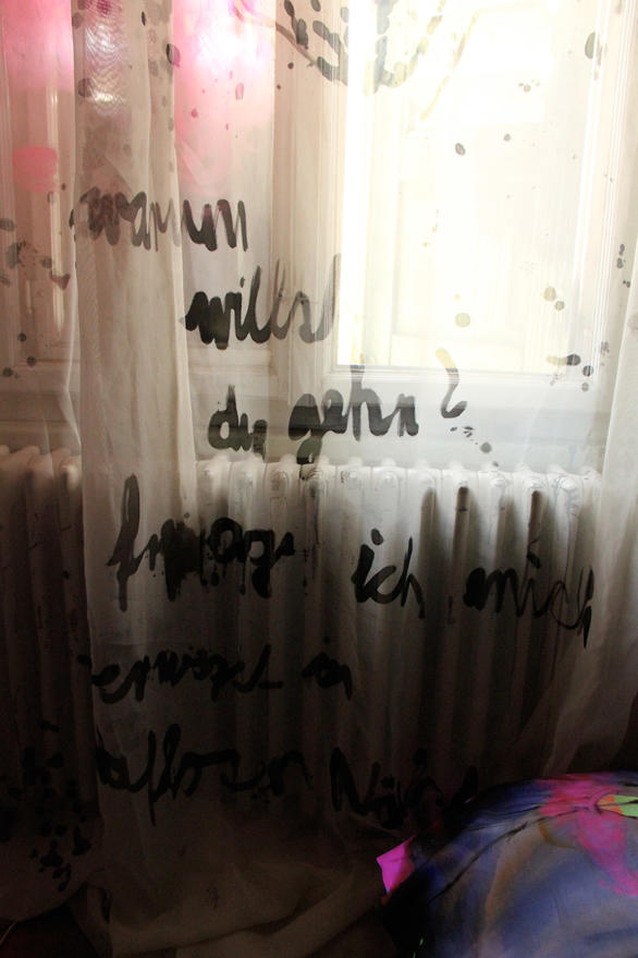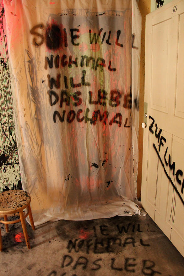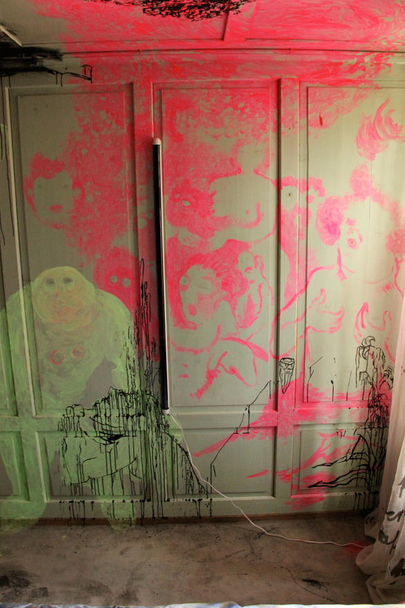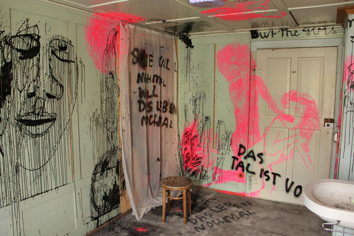The pale green room instantly took my fancy; I immediately felt like combining it with other colours. Pressure built up inside me before I entered the room. Too many ideas had accumulated and still there was a certain indecisiveness in which direction it should go content-wise. When it was finally time to work in this room, I could only vent by splashing the first images on the wall with the drawing-ink bottle and by working with forceful, strong brush strokes. I was able to approach the next wall more calmly and suddenly, many eyes, knotholes, looked at me. From this, the figures arose effortlessly. Starting points emerged everywhere, topics solidified. Text was constantly added, the circle became complete with the front of the house and the feeling that everything has to be just like this set in.